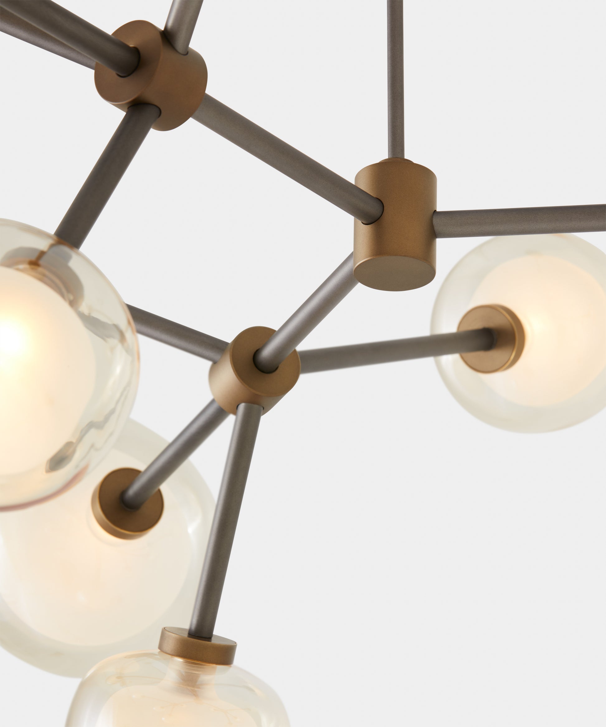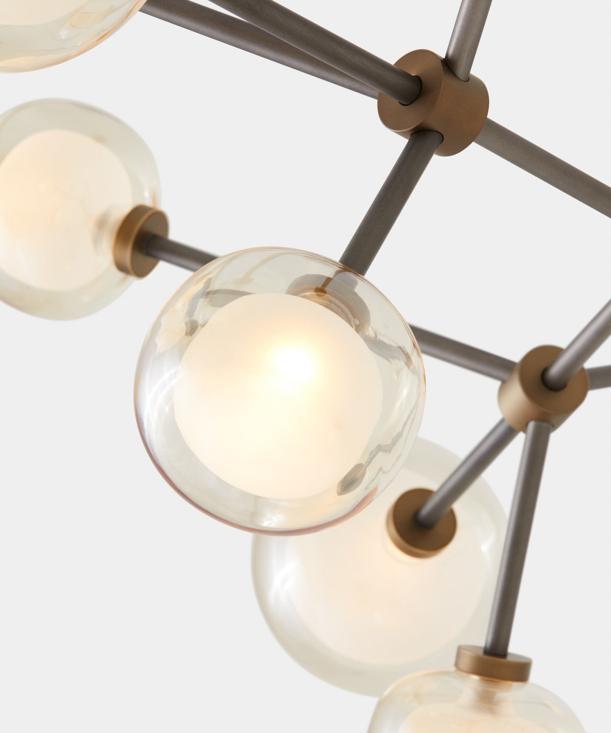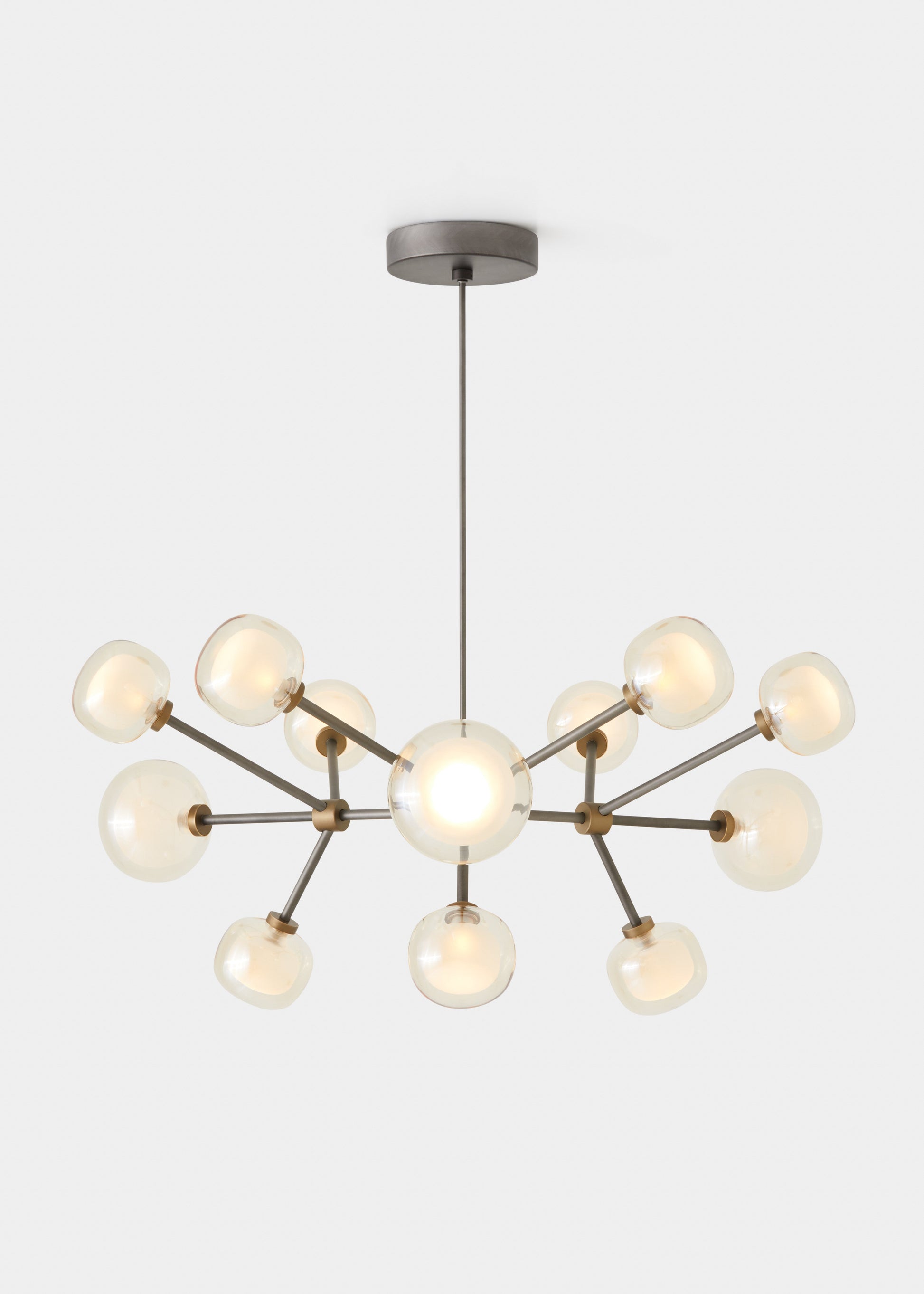 Lampada dal design elegante con diffusore sferico in vetro borosilicato soffiato, disponibile in diverse composizioni.