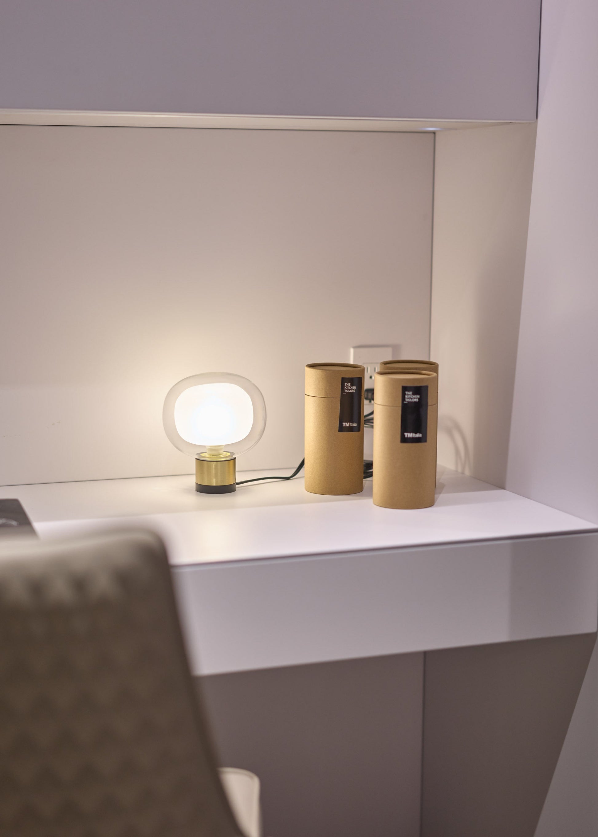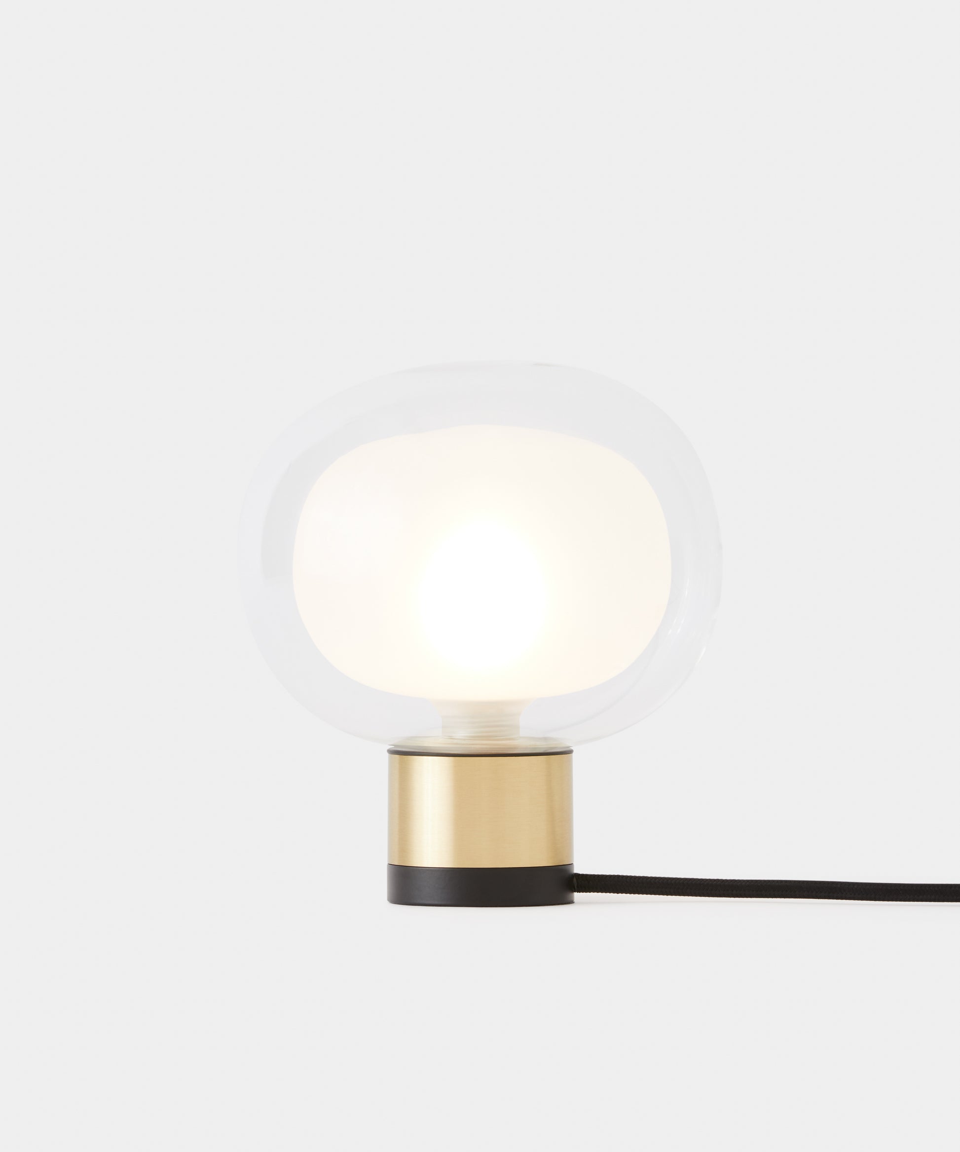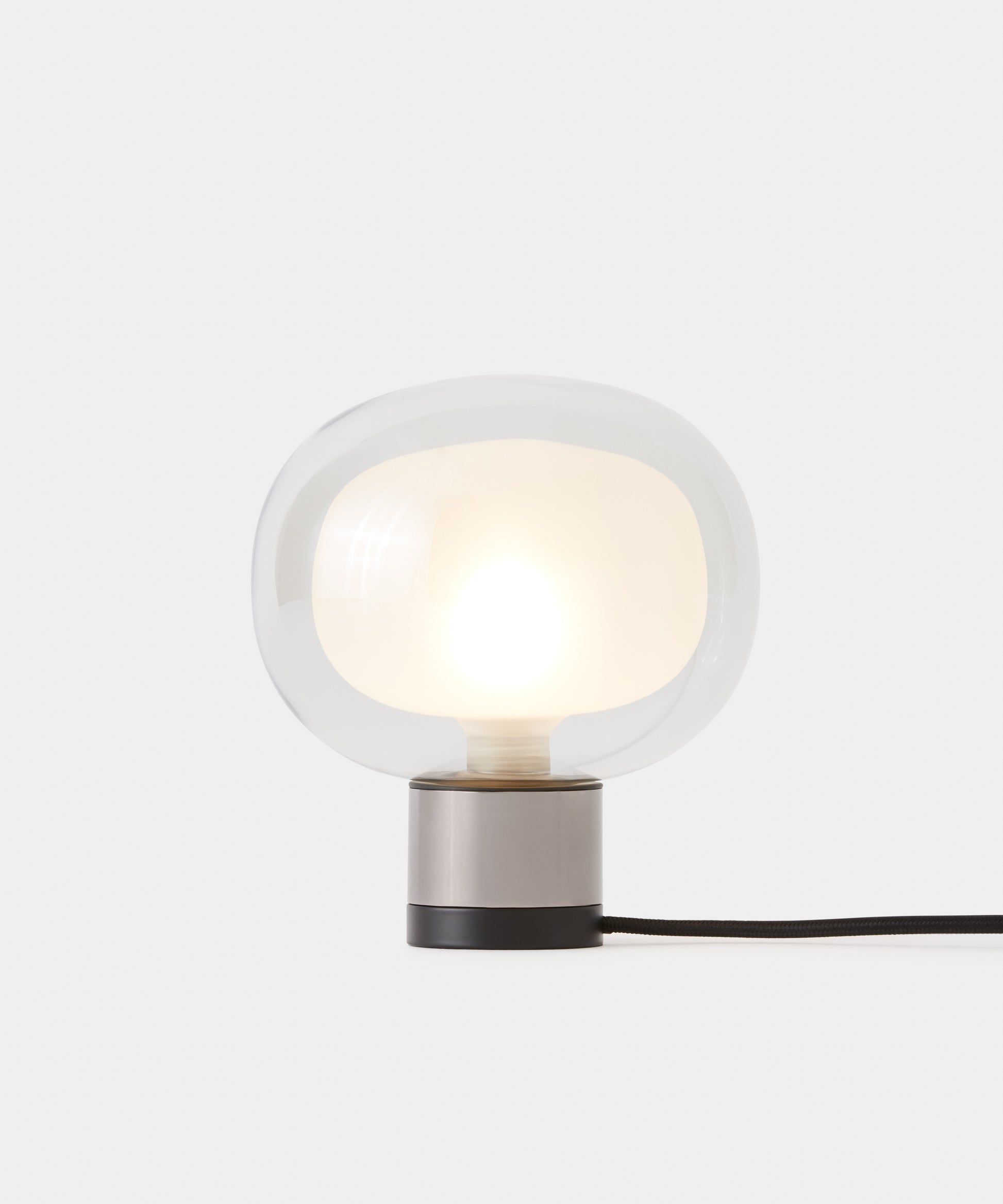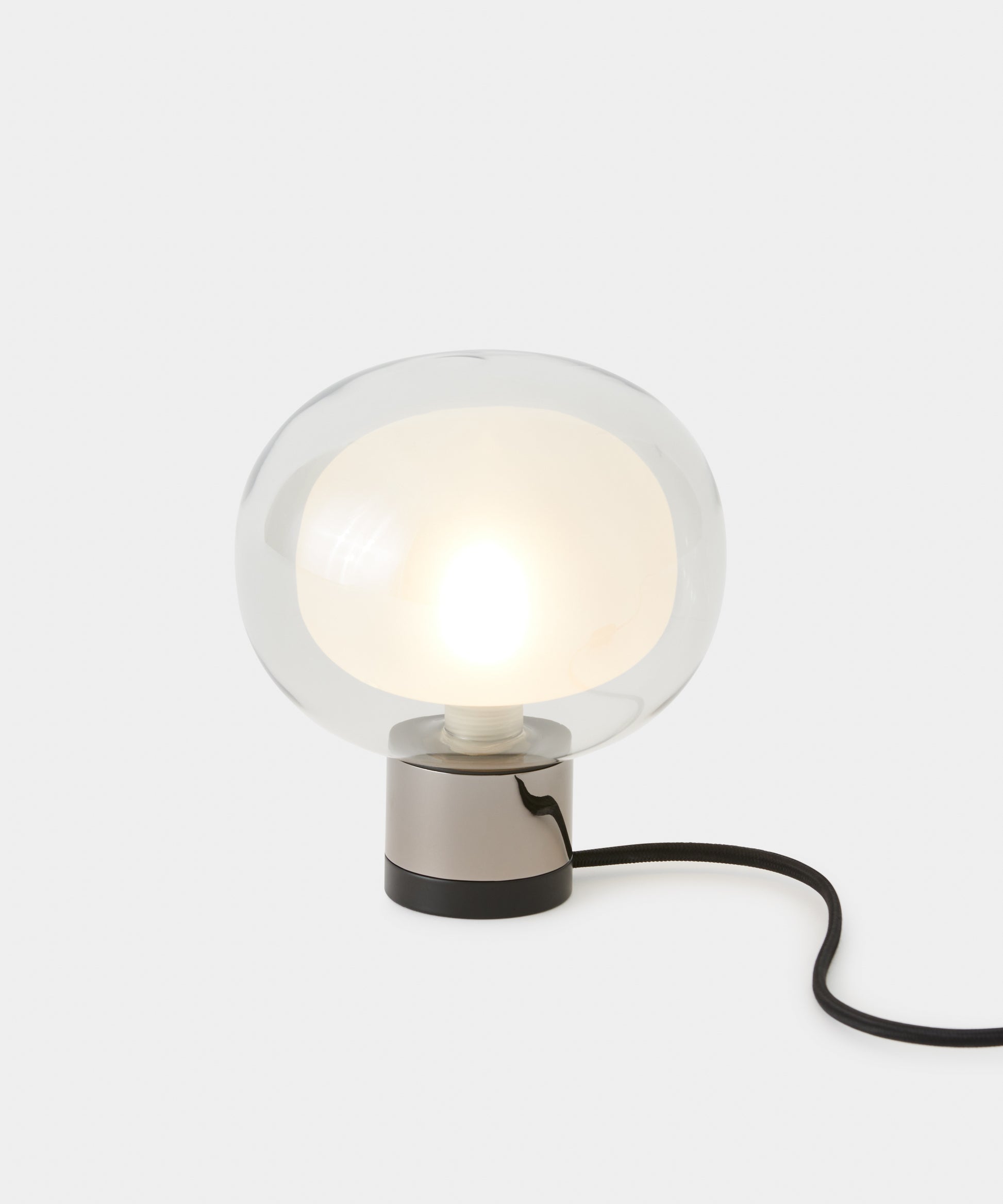 Lampada da tavolo dal design sofisticato con diffusore sferico in vetro borosilicato a doppia faccia, disponibile in diverse composizioni.