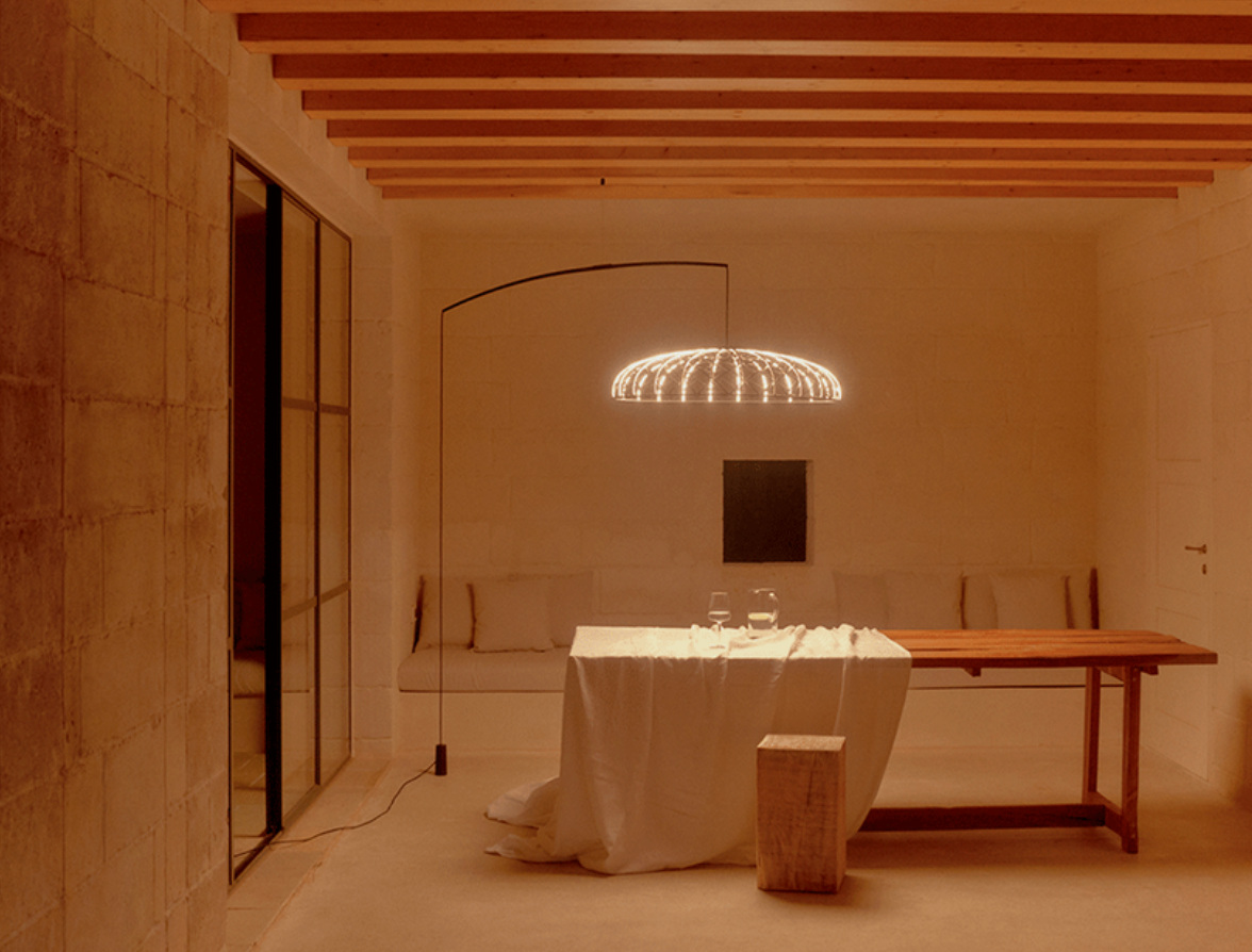 Il particolare intreccio luminoso non è solo estetica: integra moduli LED che garantiscono comfort visivo ed elevata qualità della luce, rendendola perfetta per ambienti residenziali e contract di alto livello.